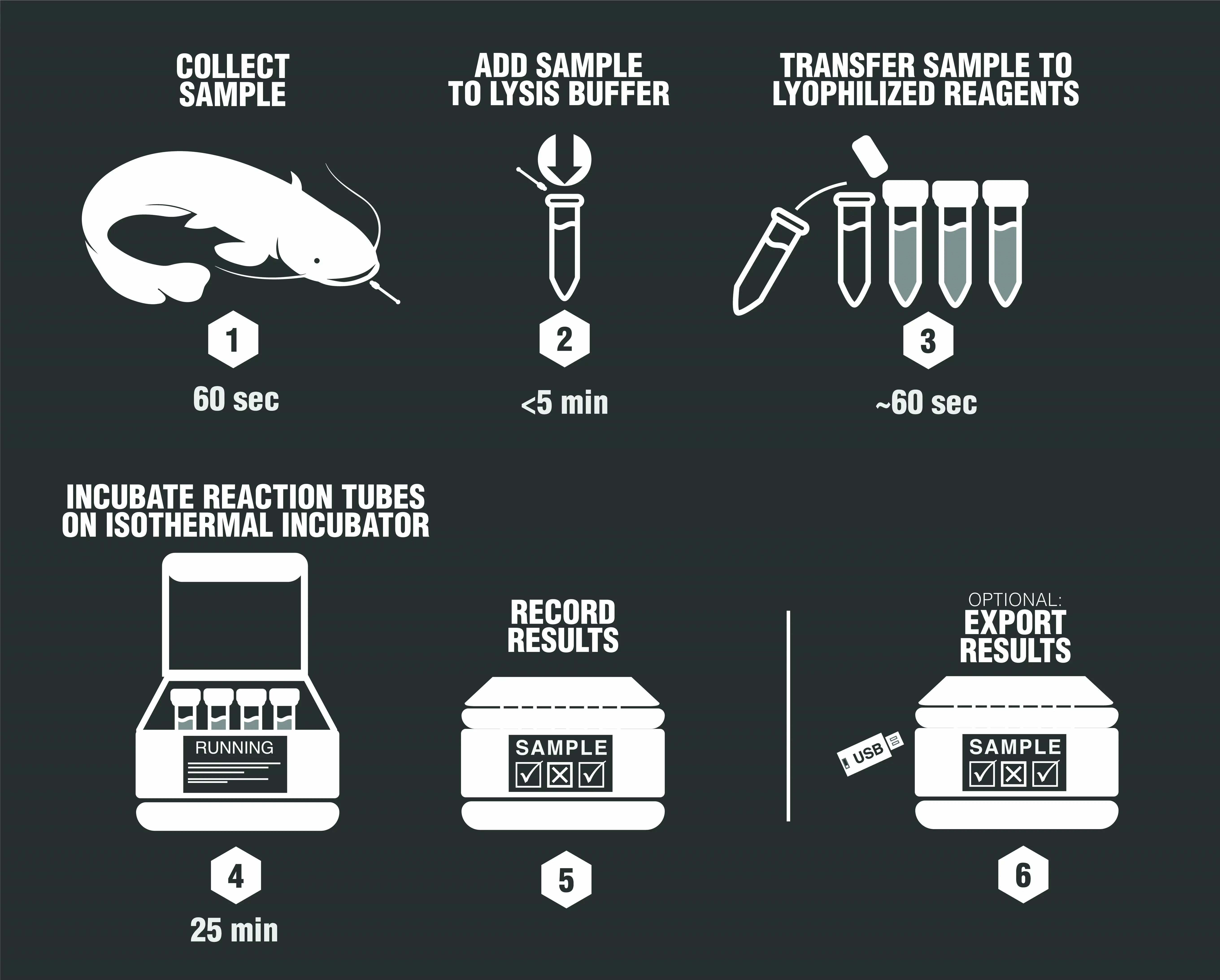 The catfish and tilapia tests can be performed pond-side using one of several commercially available isothermal fluorometers. These battery-operated instruments have a small footprint, are easy to use and can process multiple samples in a single run. Results are available within 30 minutes (including sample preparation and amplification) with minimal hands-on time and without the need for additional equipment, such as pipettes and centrifuges. Results are be displayed on-screen as positive, negative, or non-conclusive, minimizing errors caused by user interpretation.